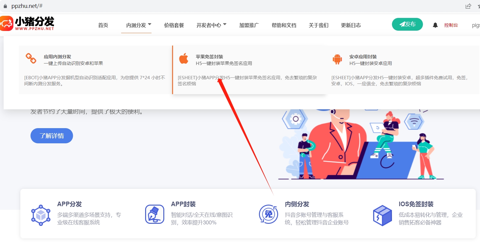 具体操作步骤: 一、打开app在线封装分发平台官网(www.appzxfz.cn),选择导航栏下的内测分发,点击苹果免签封装