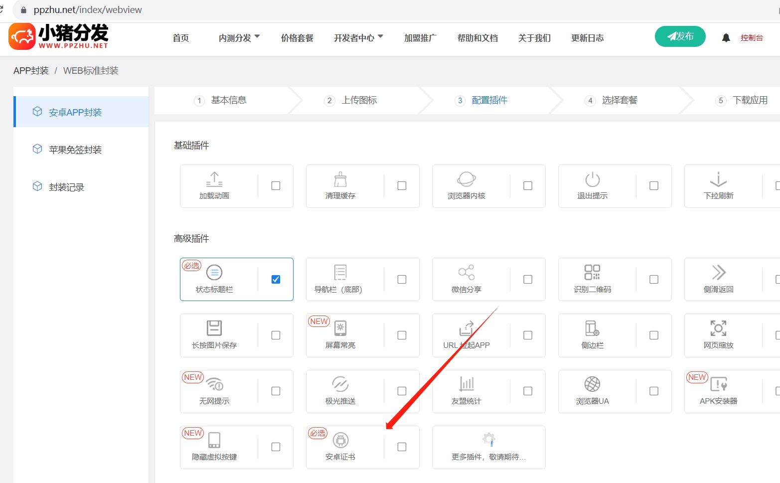 四、配置你想要的插件,安卓证书必须选择