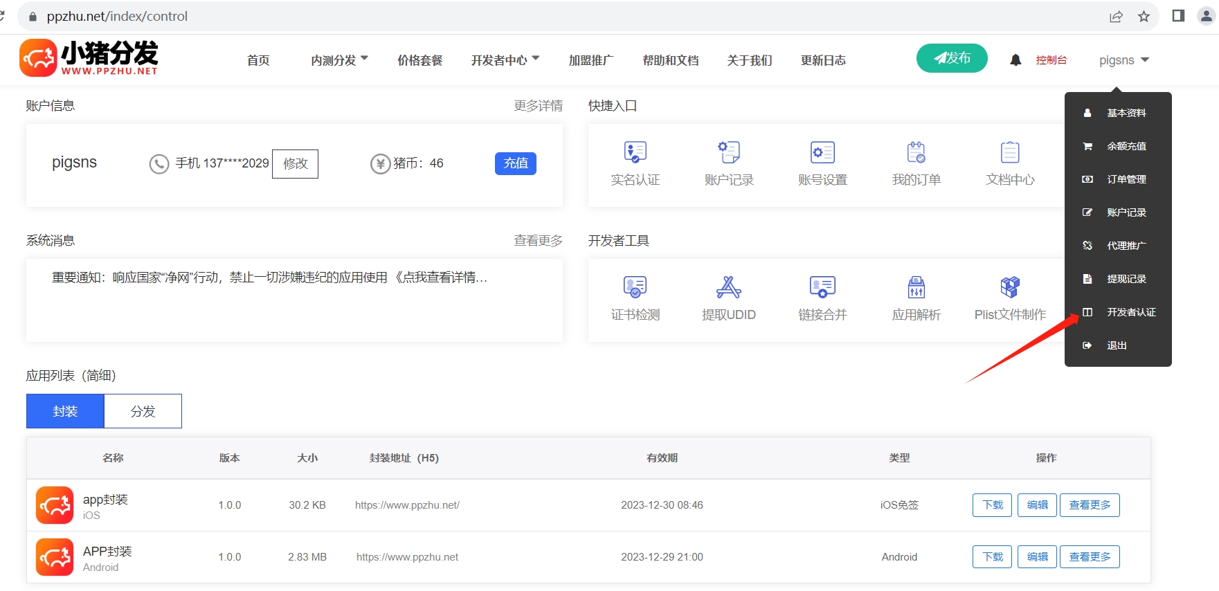 登录网站后,选择右上角用户名,点击【开发者认证】;