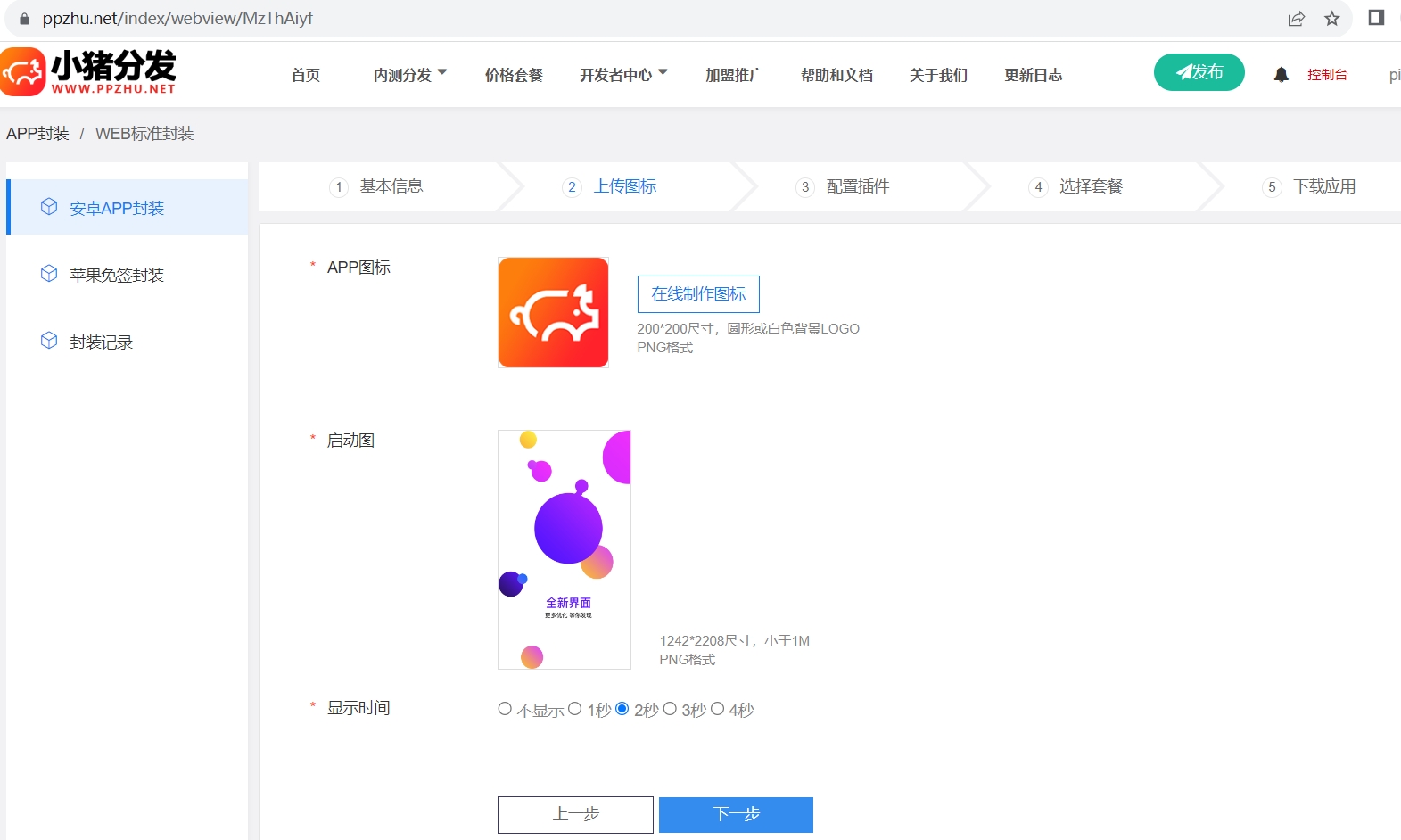 APP图标和启动图都为必填选项,支持图片上传,也支持在线制作。