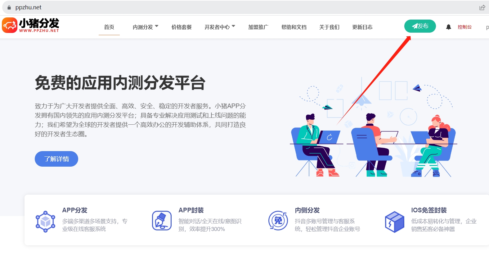 第一、上传APP ,点击导航栏【发布】按钮,点击【上传应用】。