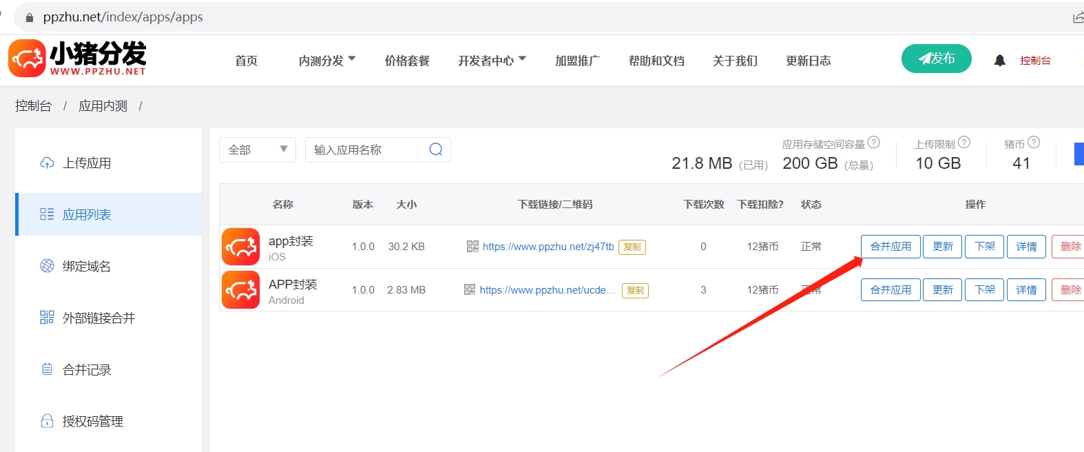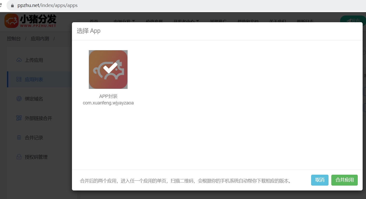例如:想合并APP分发这个应用,点击Android安卓的【合并应用】,或者iOS苹果的【合并应用】