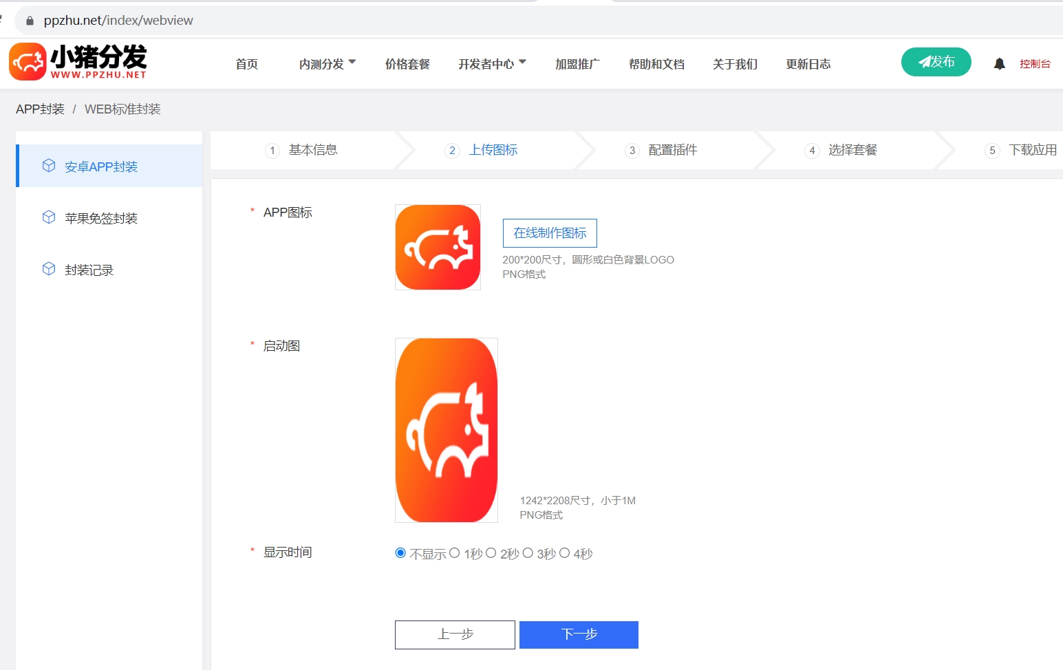 三、点击下一步,上传你的app图标以及启动图,图标可以点击在线制作生成,启动图选择相应的显示时间。